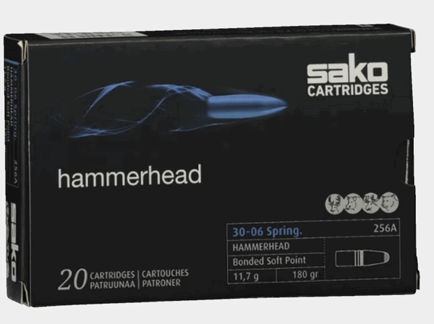 Sako S-Hammerhead .30-06 — bonded jaktkule utviklet for storviltjakt, som kombinerer kontrollert ekspansjon, høy restvekt og god penetrasjon. Kulens kjerne er kjemisk/bondet til mantelen for å hindre separasjon ved treff, og den tunge, helmantlede bakdelen sørger for at kulen holder sammen ved mushrooming — også ved treff mot ben. Semi-spitzer, boat-tail profilen gir bedre ballistisk effektivitet og flatere bane, noe som gir mer energi på lengre hold. Designet og testet i Sakos balistiske laboratorier og i felttester, S-Hammerhead gir forutsigbar terminaleffekt, solide blodspor og god stoppkraft på mellomlange hold — et klart valg for jegere som vil ha en bonded kule med høy pålitelighet.