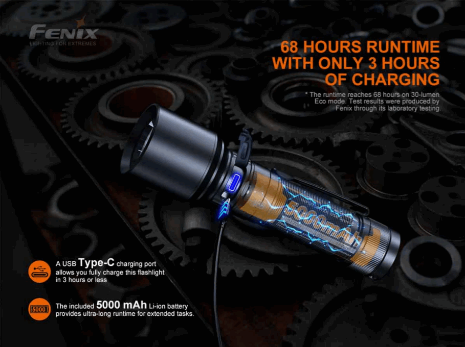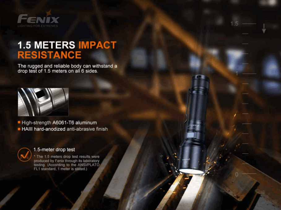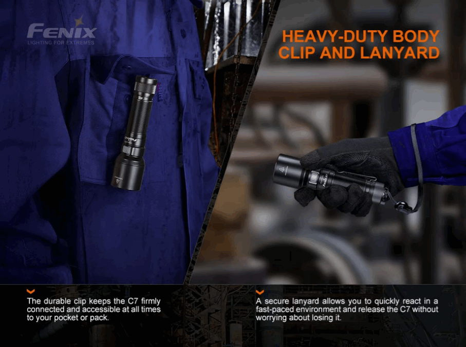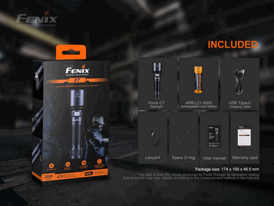 Fenix C7-lommelykten er en høytytende lommelykt som er det perfekte verktøyet for industrielle og vedlikeholdsoperasjoner. Med opptil 3000 lumen kan Fenix C7-lommelykten kaste lys på en maksimal avstand på 470 meter (1542 fot). Du vil alltid vite batteristatusen med batterinivåindikatoren, og holde det inkluderte 5000mAh-batteriet ladet via USB Type-C-porten. Den magnetiske basen på Fenix C7 lar deg feste lommelykten til de fleste metalloverflater for håndfri belysning. Vanntett, støvtett og støtsikker opptil 1 meter, er C7-lommelykten bygget tøff nok til å tåle alt arbeidsplassen din kan utsette den for.
