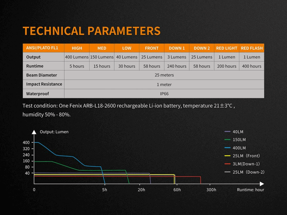 Merk: De ovennevnte parametrene (lab-testet ved bruk av ett Fenix ARB-L18-2600 oppladbart Li-ion batteri) kan variere mellom forskjellige miljøer.