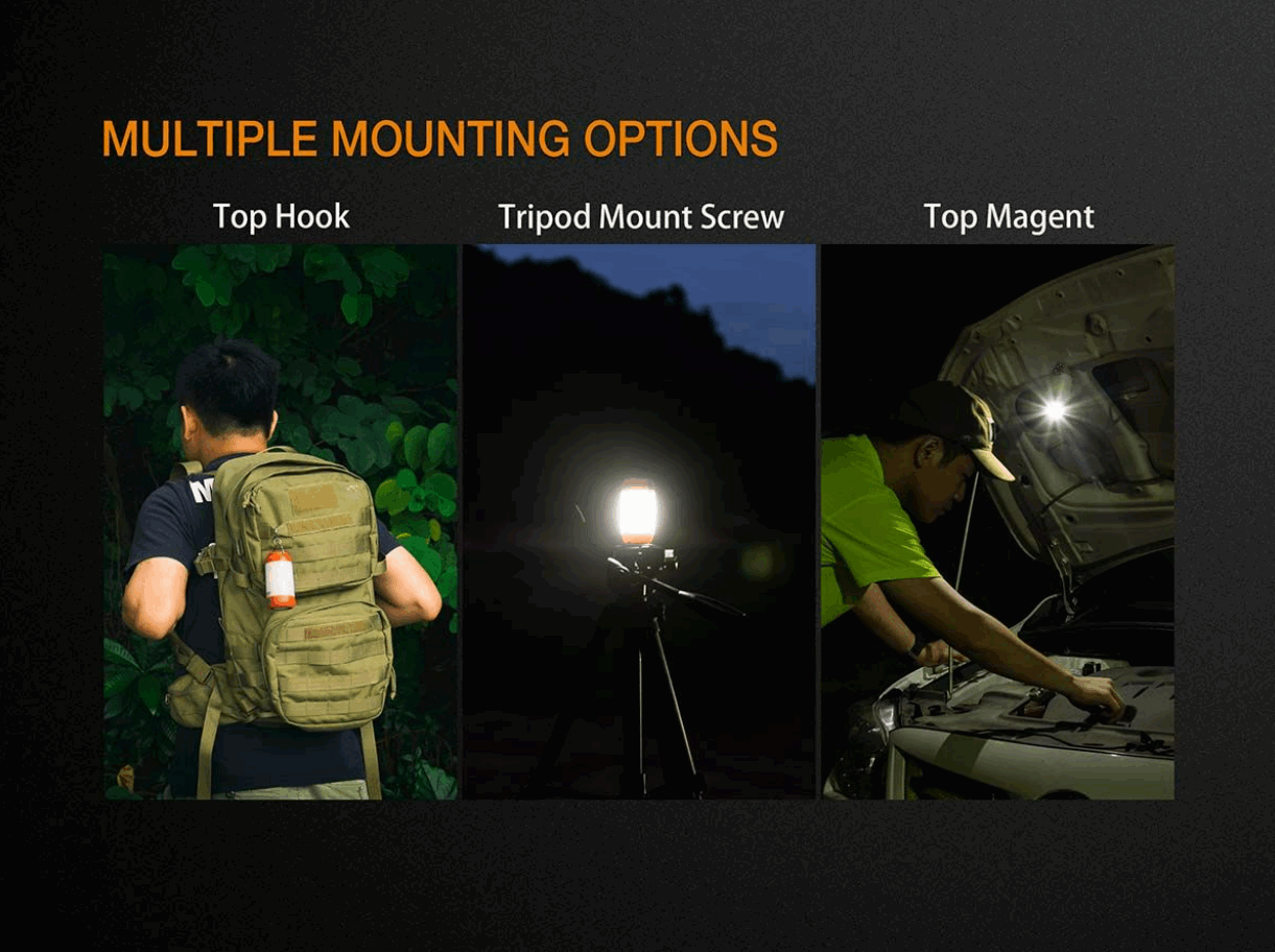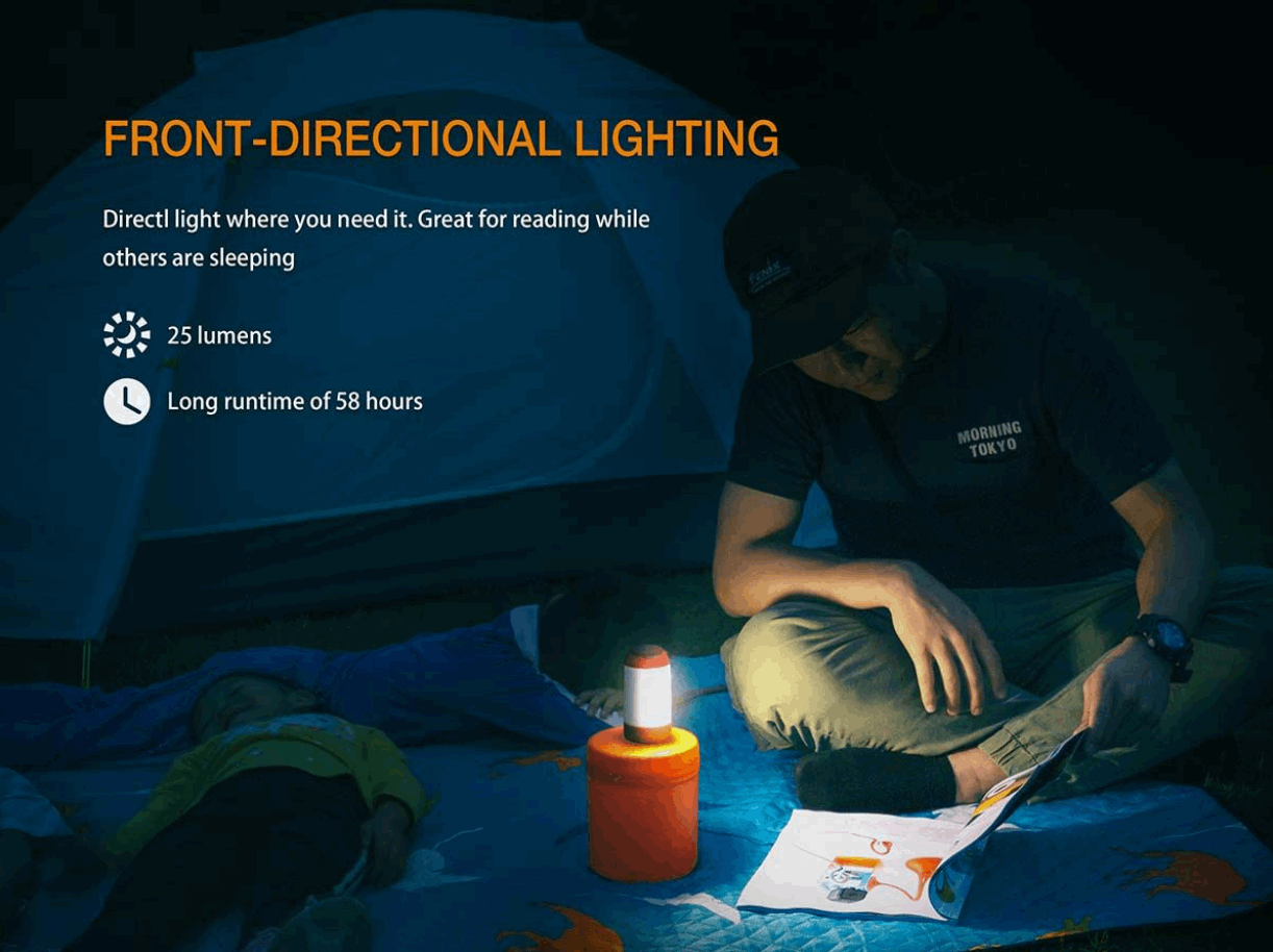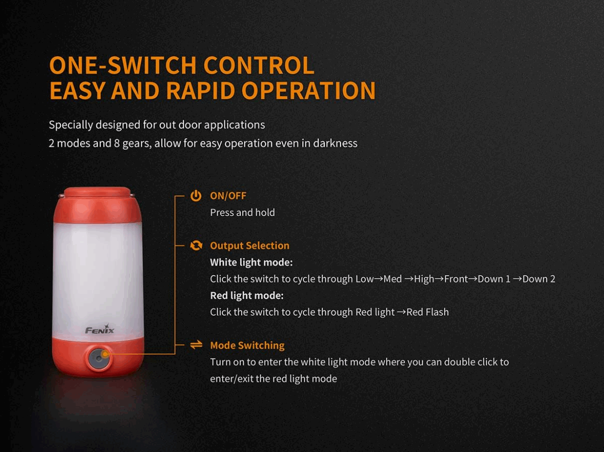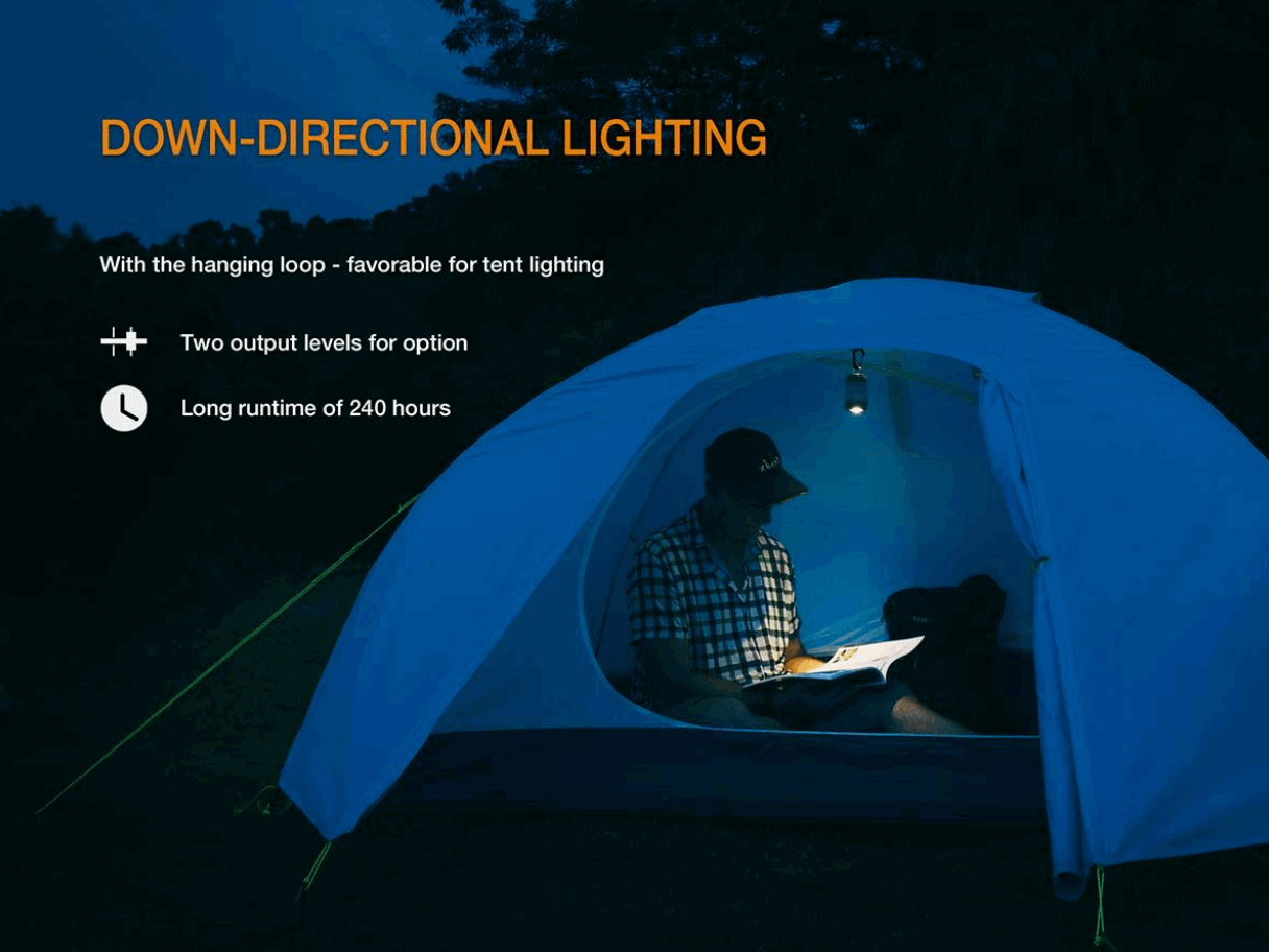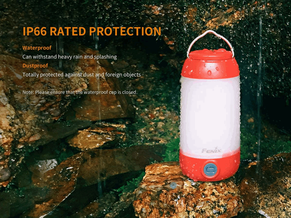 Fenix CL26R Lantern er en allsidig, lett campinglykt. Drevet av et oppladbart 18650 batteri (inkludert), leverer denne lykten en maksimal lysstyrke på 400 lumen, nok lys til å opplyse hele campingplassen din. En unik funksjon ved lykten er de multidireksjonelle lysmodusene: tre lysstyrkenivåer av 360° lys, et frontlys og to lysstyrkenivåer av nedadrettet lys. Unik varmefordeling gir enestående ytelse i kulde. Ekstremt slitesterk og regnbestandig, er denne lykten en perfekt følgesvenn for camping.