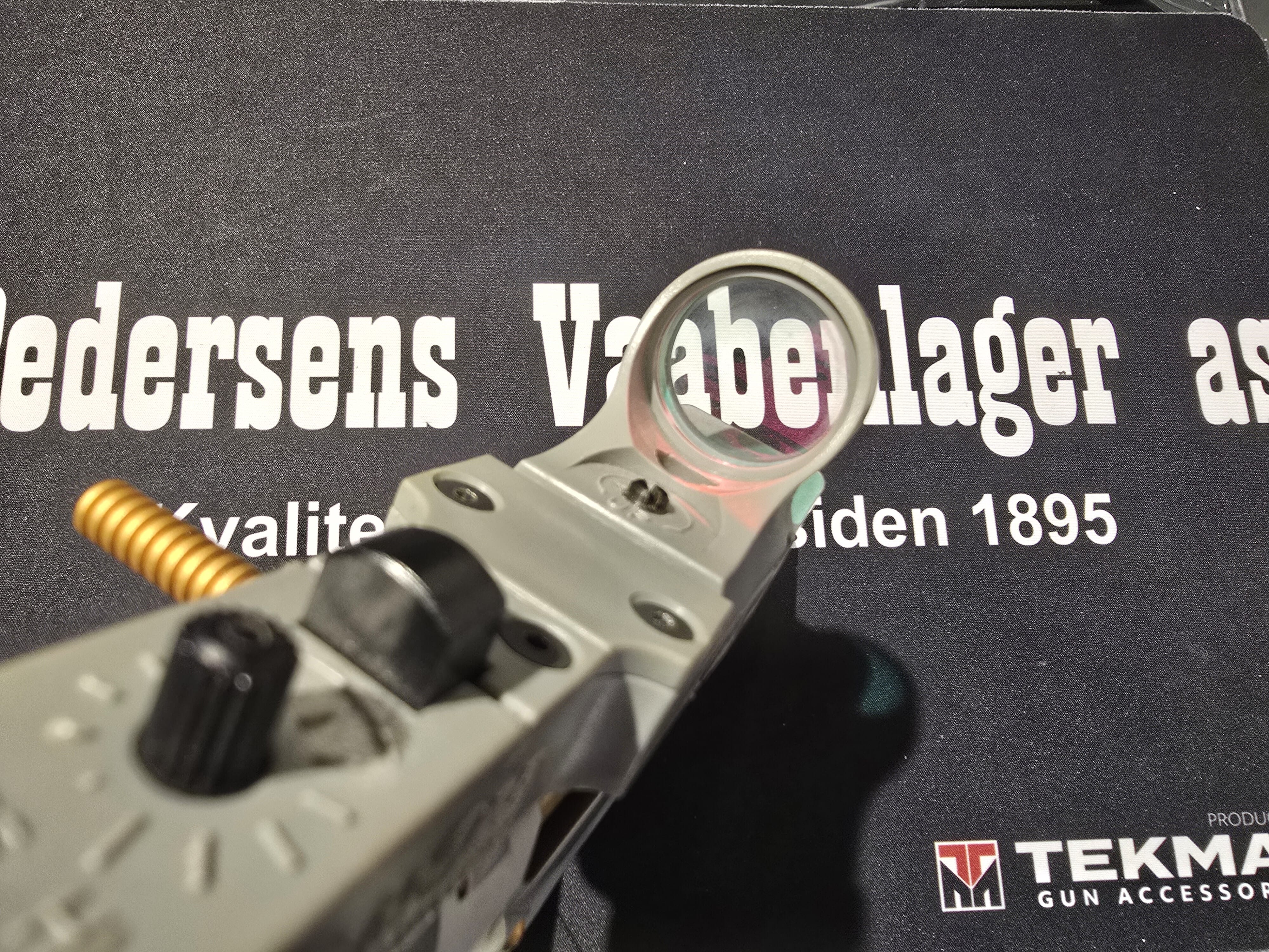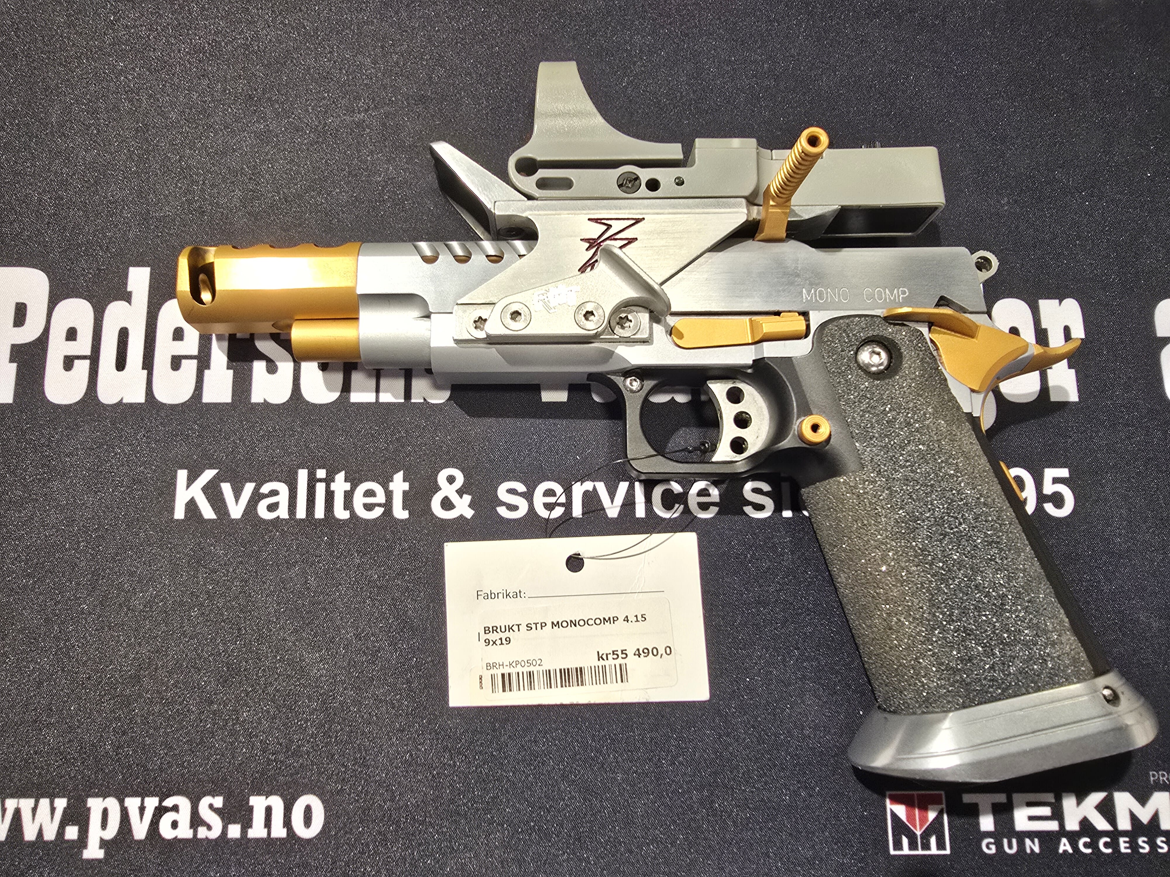 Dette er en brukt pistol. Det er påmontert et C-More sikte.