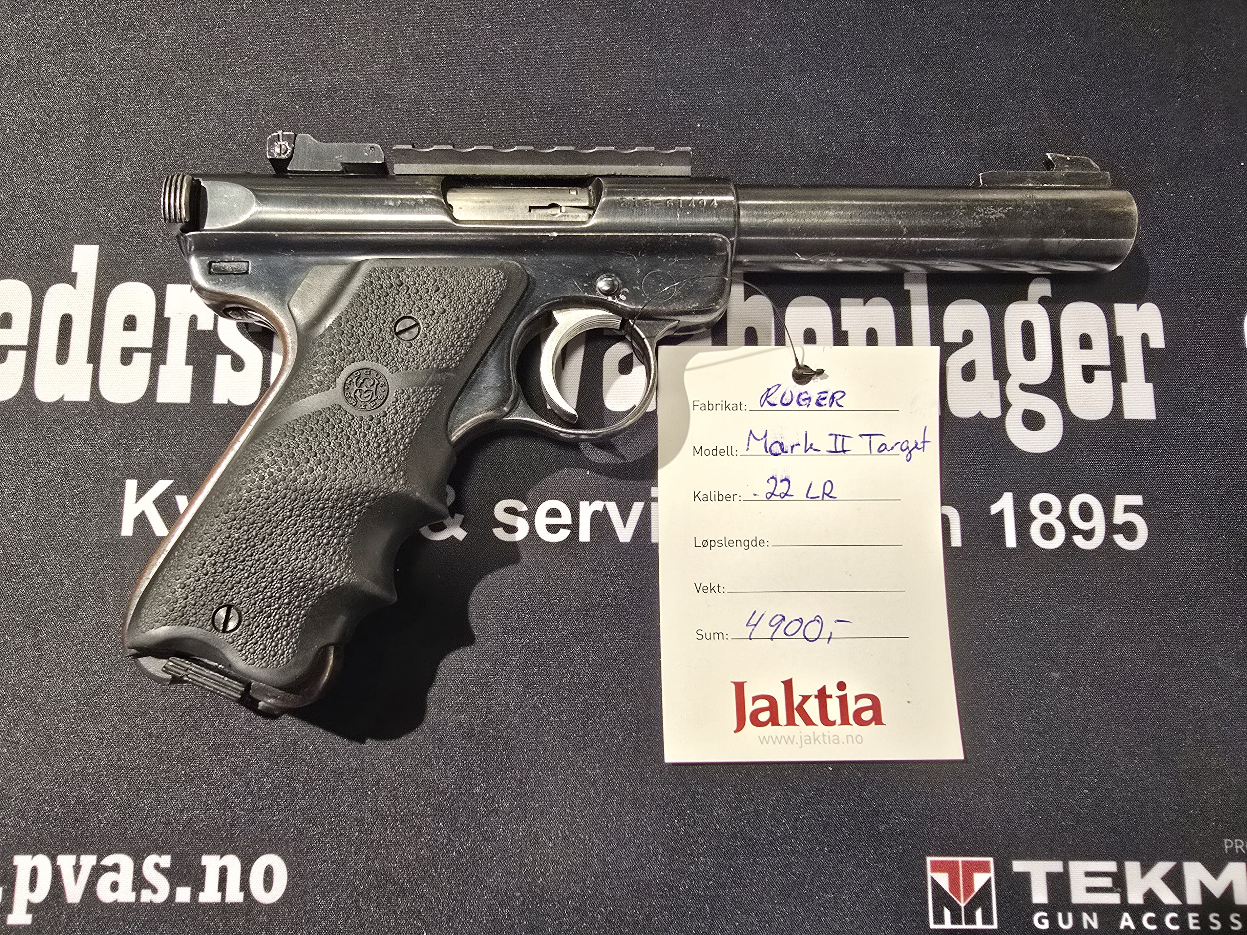 Ruger Mark II Target er en velkjent .22 LR-pistol med solid rykte for presisjon og driftssikkerhet. Denne brukte Mark II-utgaven er bygd for målskyting og trening, og kombinerer klassisk Ruger-konstruksjon med praktiske oppgraderinger: Picatinny-feste for optikk, komfortable Hogue gummigrep og justerbart baksikte for finavstemming av treffbildet.
