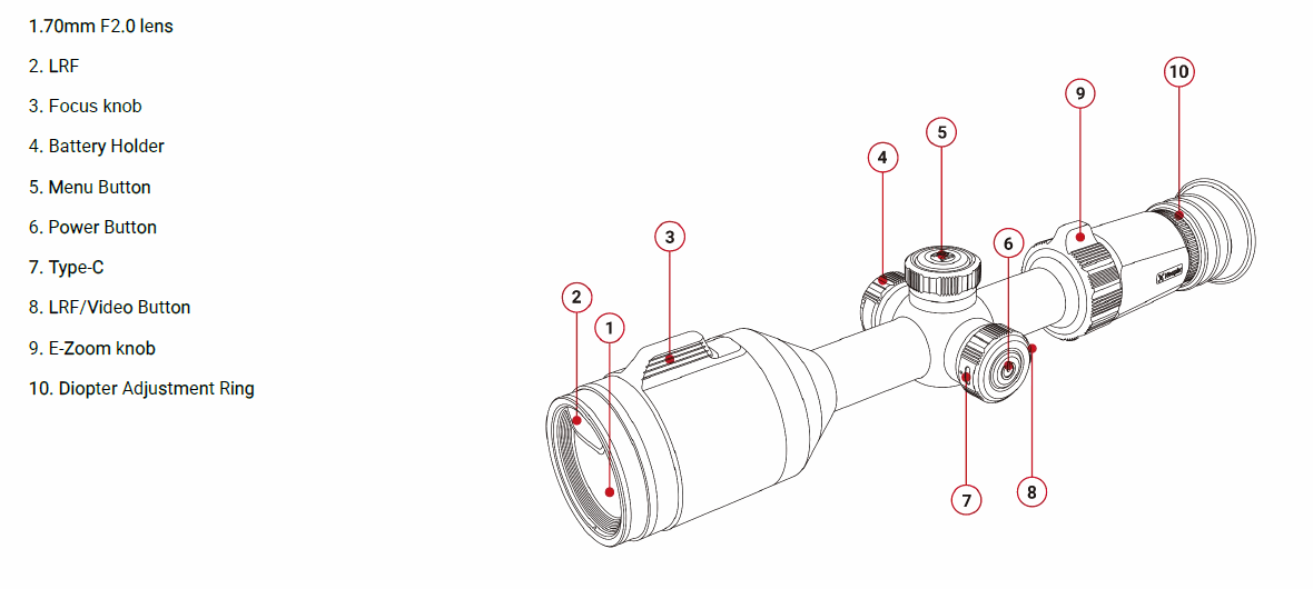 Den store 70 mm F2.0-linsen gir lyssterk og klar optikk, med 5× grunnforstørrelse og trinnløs digital zoom helt opp til 40×. Kombinert med den integrerte laseravstandsmåleren (LRF) med rekkevidde på 1200 meter og ±1 m nøyaktighet, får du eksakt målavstand – direkte inn i den ballistiske kalkulatoren som automatisk beregner riktig holdover.